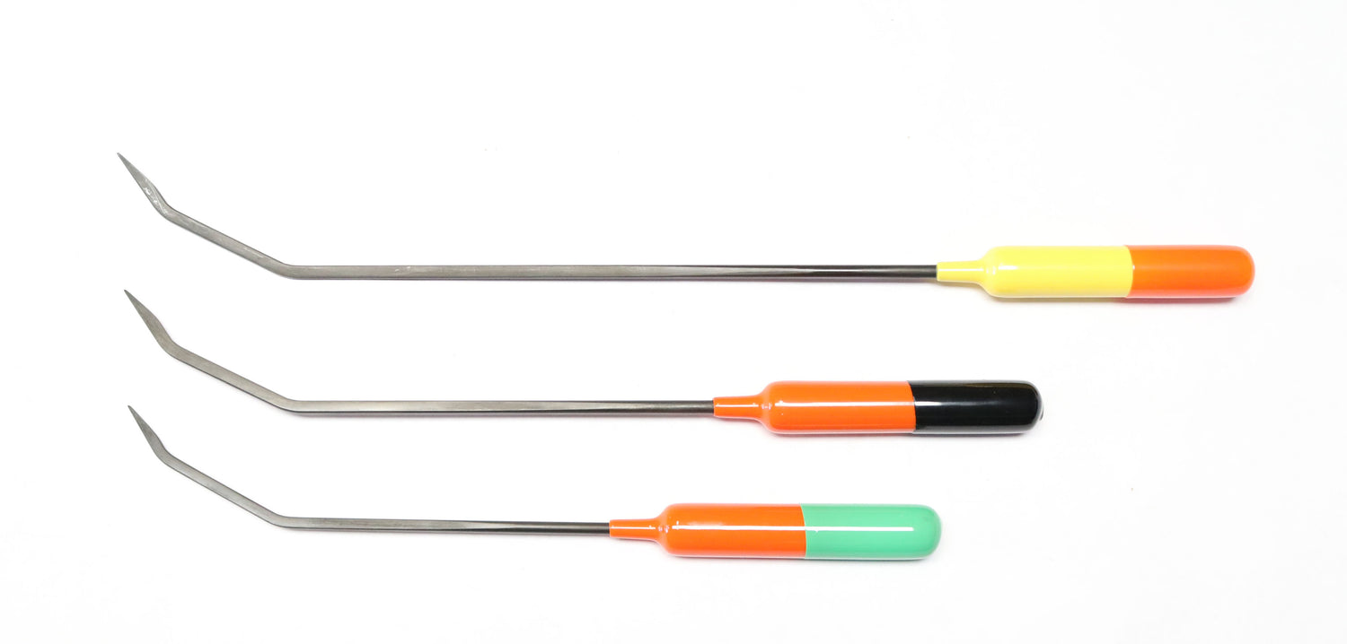 Daniel Gromm inspired door handle tool fits in factory holes and tight spots. Sharp tip, double bend shaved spring steel for strength and flexibility.